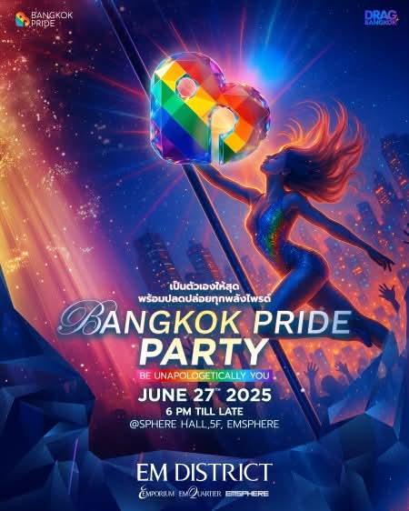และเตรียมปิดท้าย Pride Month แบบปังๆ กับงาน “Bangkok Pride Party 2025” ที่ปีนี้จัดยิ่งใหญ่แบบให้ทุกคนเป็นตัวของตัวเองให้สุด ปลดปล่อยทุกพลังไพรด์ พร้อมเชิญชวนชาว LGBTQIAN+ และสายปาร์ตี้ทุกเพศสภาพ มาร่วมปาร์ตี้เฉลิมฉลองพลัง LGBTQIAN+ ความเท่าเทียม และความสำเร็จอีกก้าวสำคัญ สู่เป้าหมายการประกาศความพร้อมว่า กรุงเทพมหานคร ประเทศไทยพร้อมเป็นจุดหมายปลายทางแห่ง Pride ระดับโลก และเป็นเจ้าภาพจัด Bangkok World Pride 2030 อย่างสมศักดิ์ศรี ส่งท้ายเดือน Pride กันในวันศุกร์ที่ 27 มิถุนายน 2568 ตั้งแต่เวลา 18.00 น.เป็นต้นไป ที่ Sphere Hall 5F Emsphere โดยติดตามรายละเอียดและเข้าไปจองบัตรเข้างานได้ที่ Page Facebook: บางกอก ไพรด์ และ https://www.zipeventapp.com/e/Bangkok-Pride-Party เพราะเราคือ “Born This Way”