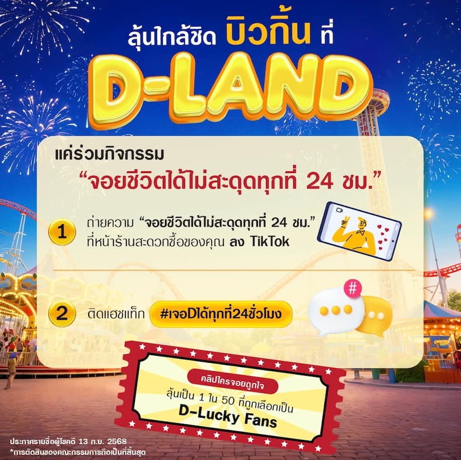 ที่ดินแดนแห่งความสนุก D-LAND อัดแน่นกิจกรรมความสนุก จัดเต็มของขวัญสุดพิเศษมากมาย พร้อมลุ้นเป็น D-Lucky Fan ได้ถ่ายรูปและทำกิจกรรมแสนสนุกสุดเอ็กซ์คลูซีฟกับหนุ่มบิวกิ้น ที่รับรองฟินกระจาย! ในวันเสาร์ที่ 20 กันยายน 2568 ที่ GAYSORN AMARIN Forum Event Space ตั้งแต่เวลา 10.00 น. เป็นต้นไป