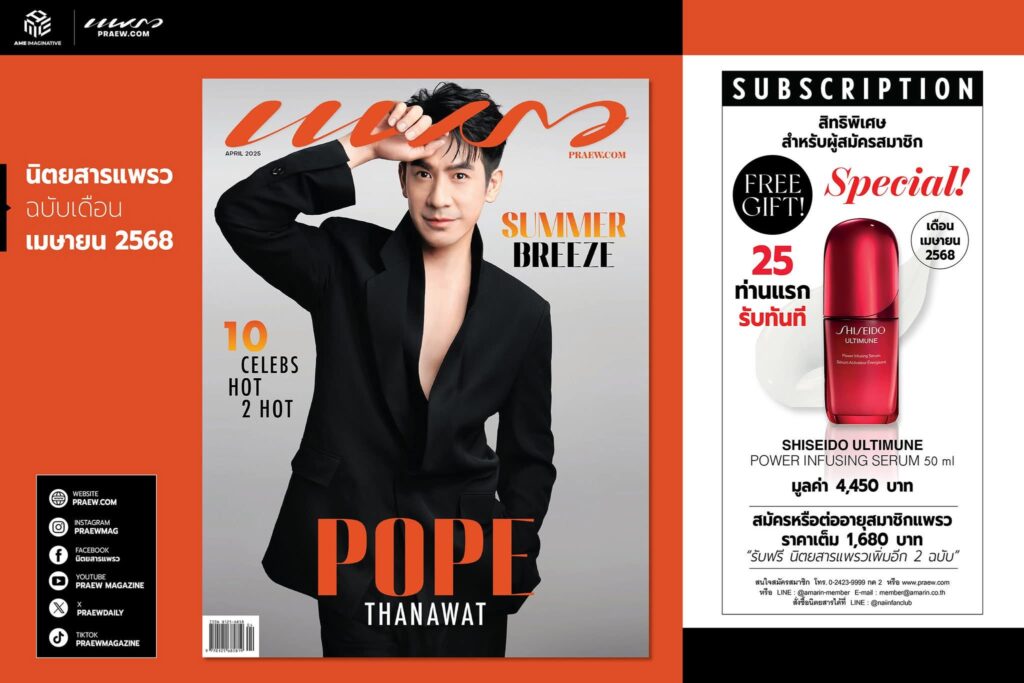ท่ามกลางวงการบันเทิงที่มีการแข่งขันสูง แต่มีหนึ่งในนักแสดงไม่กี่คนที่ไม่มีช่องยูทูป ไม่มีแฟนมีตติ้ง และออกอีเวนต์น้อย แม้ปัจจุบันเขาจะพักงานไปถึง 2 ปี แต่กลับไม่เคยตกกระแส แฟนๆ ยังคงพูดถึง และคิดถึงเขาเสมอ “โป๊ป – ธนวรรธน์ วรรธนะภูติ” ล่าสุด นิตยสารแพรว โดย บริษัทเอเอ็มอี อิมเมจิเนทีฟ จำกัด ในเครืออมรินทร์กรุ๊ป ได้พา โป๊ป ขึ้นปกแพรว ฉบับเดือน เม.ย. 68 ภายใต้คอนเซ็ปต์สุดเท่ ทำใจละลาย โดยนอกจากแฟชั่นเซ็ตที่อัดแน่นไปด้วยเสน่ห์ของนักแสดงหนุ่มคนนี้แล้ว ยังมีบทสัมภาษณ์อัปเดตชีวิตในมุมใหม่ๆ มาให้อ่านกันอย่างจุใจอีกด้วย