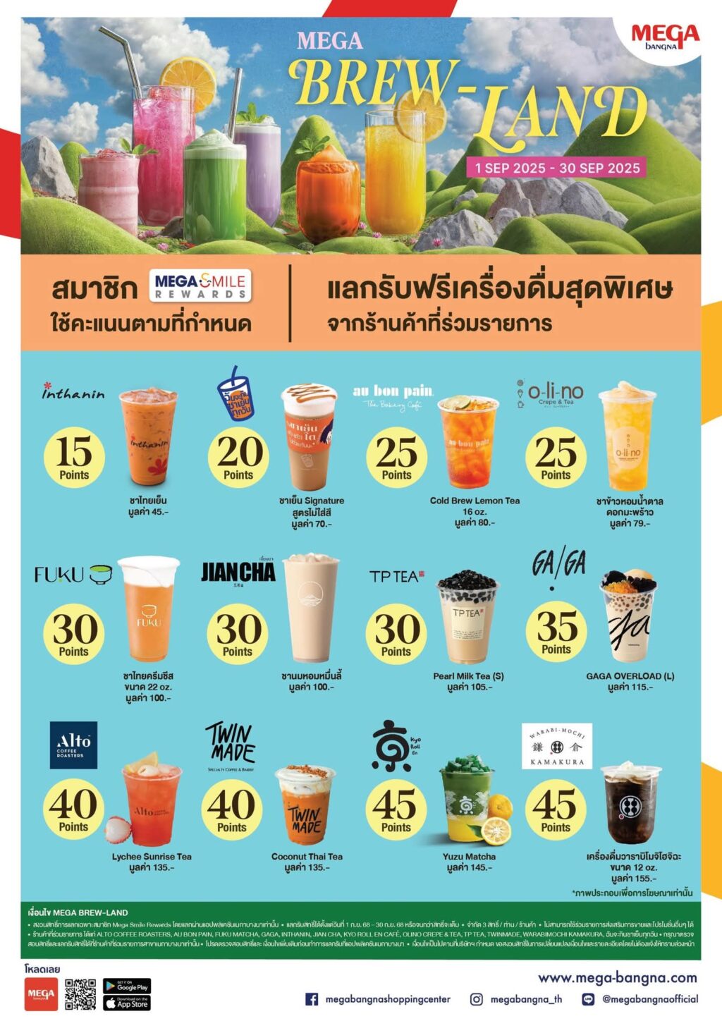 ศูนย์การค้าเมกาบางนา แหล่งช้อปปิ้งที่ใหญ่ที่สุดแห่งกรุงเทพฯ ฝั่งตะวันออก พร้อมเติมเต็มประสบการณ์การใช้ชีวิตให้ทุกๆ วันมีความสุขมากยิ่งขึ้น ด้วยแนวคิด YOUR EVERYDAY MEETING PLACE ชวนทุกคนมาเติมความสดชื่นในสไตล์ที่เป็นคุณ กับแคมเปญ “MEGA BREW-LAND” ที่คัดสรรเมนูเครื่องดื่มชาแสนอร่อยจาก 12 ร้านดัง ได้แก่ ALTO COFFEE ROASTERS, AU BON PAIN, FUKU MATCHA, GAGA, INTHANIN, JIANCHA, KYO ROLL EN, O-LI-NO CREPE & TEA, TP TEA, TWIN MADE, WARABIMOCHI KAMAKURA และ ฉันจะกินชาเย็นทุกวัน ให้สมาชิก เมกา สไมล์ รีวอร์ดส ใช้คะแนนตามที่กำหนด แลกรับฟรี! กับเมนูหลากหลายรสชาติ ทั้งชาไทยรสเข้ม ชาเขียวมัทฉะหอมละมุน ชาผลไม้กลิ่นสดชื่น หรือเมนูชาสุดครีเอทีฟที่ตกแต่งอย่างสวยงาม จนสาย Café Hopping ต้องรีบแวะเช็กอิน พร้อมลิ้มลองรสชาติใหม่ๆ ได้ทุกวัน ตั้งแต่วันที่ 1 – 30 กันยายน 2568 ที่ศูนย์การค้าเมกาบางนาเท่านั้น