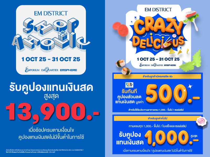 จัดแคมเปญ SHOPAHOLIC และ CRAZY DELICIOUS ระหว่างวันที่ 1 – 31 ตุลาคม 2568 ที่ เอ็ม ดิสทริค มอบโปรโมชันสุดเอ็กซ์คลูซีฟให้ลูกค้า เมื่อช้อปปิ้งแบรนด์ชั้นนำระดับโลก และรับประทานอาหารในร้านอาหารชั้นนำที่ เอ็มโพเรียม เอ็มควอร์เทียร์ และเอ็มสเฟียร์ ร่วมสร้างความคึกคักเปิดตลาดไตรมาสสุดท้ายของปี 2568
