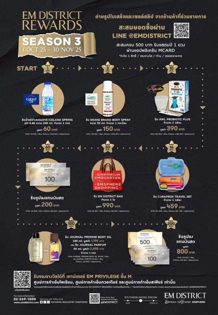 นอกจากนี้นักช้อปปิ้งยังสะสมใบเสร็จผ่าน Line @Emdistrict กับแคมเปญ EM DIDTRICT REWARDS SEASON 3 ช้อปครบ 500 บาท รับแสตมป์ 1 ดวงผ่าน MCARD APPLICATION แลกรับรางวัลพิเศษมากมาย อาทิ คูปองแทนเงินสด, Journal, AWL Probiotic Plus, น้ำแร่ด่าง Iceland Spring, Snake Brand Body Spray และอีกมากมาย