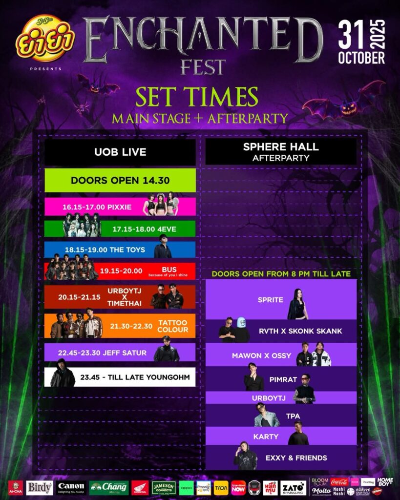 พร้อมกันรึยังกับโค้งสุดท้ายที่จะมาปลดปล่อยวิญญาณความมันส์ใน งาน YUMYUM presents ENCHANTED FEST 2025 (ยำยำ พรีเซ็นต์ เอ็นแช้นเท็ด เฟส 2025) โดย Enchanted VIP(เอ็นแช้นเท็ด วีไอพี) นำทีมโดย นายชาร์ล โรเบิร์ต Head Project Director กับฮาโลวีนมิวสิกเฟสติวัลสุดยิ่งใหญ่ใจกลางเมืองที่ทุกคนรอคอย ที่จะพาทุกคนเข้าสู่ความมันส์แห่งโลก ENCHANTED WORLD ในค่ำคืนวันฮาโลวีนอย่างแท้จริง จัดเต็ม 2 เวที 2 สไตล์ ในวันเดียวกัน เอาใจทุกทาร์เกตทั้งสายคอนเสิร์ต ณ UOB LIVE at EMSPHERE กับไลน์อัพ ศิลปินตัวท็อปของไทย ได้แก่ BUS because of you i shine, JEFF SATUR, TATTOO COLOUR, 4EVE, THE TOYS, PIXXIE, URBOYTJ x TIMETHAI และ YOUNGOHM ซึ่งในปีนี้นอกจาก ENCHANTER ทุกคนจะได้พบกับพลังการโชว์แบบ DUO ครั้งแรกจาก URBOYTJ x TIMETHAI แล้ว ยังมีอีกความพิเศษที่ทุกคนพลาดไม่ได้ กับเซอร์ไพร์สโชว์ จาก BUS because of you i shine ที่บอกเลยว่ามีแค่บนเวที ENCHANTED FEST 2025 เท่านั้น!! ส่วนสายปาร์ตี้ ห้ามพลาด กับเวที “ENCHANTED FEST 2025 OFFICIAL AFTERPARTY” ณ SPHERE HALL at EMSPHERE กับไลน์อัพ DJ Set ที่จัดมาแบบเน้นๆ ไม่ว่าจะเป็น TPA, DJ KARTY, DJ SPRITE, DJ EXXY , DJ Mawon x DJ OSSY และ DJ RVTH x MC SKONK SKANK โดยฮอลล์นี้มีแขกรับเชิญสุดพิเศษที่มาอัพเลเวลความเดือดอย่าง URBOYTJ ที่พร้อมทุ่มสุดตัวเสริ์ฟความมันให้แฟนๆทั้ง 2 สาย อีกทั้งยังจัดเซอร์ไพร์สให้กับโชว์ฮาโลวันเซ็ตใหม่ล่าสุดสำหรับ ENCHANTER สายปาร์ตี้ทุกคนอีกด้วย
