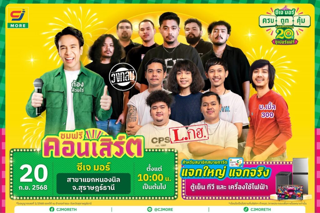 ซีเจ มอร์ (CJ MORE) เตรียมสุดยอดแห่งความมันส์ยกกำลังสามเอาใจชาวสุราษฎร์ กับคอนเสิร์ตใหญ่ “ซีเจ มอร์ ครบถูกคุ้ม ฉลองครบรอบ 20 ปี ซูเปอร์แฟร์” ขนทัพศิลปินขวัญใจสายอินดี้และลูกทุ่งมาเสิร์ฟความสนุกแบบใกล้ชิดกันถึงสุราษฎร์ธานี นำโดย ก้อง ห้วยไร่, วงกลม, L.กฮ. และ บ.เบิ้ล 300 พร้อมขนเพลงฮิตติดชาร์ตมาจัดเต็มให้แฟนเพลงได้กรี๊ดสนั่นตลอดทั้งวัน โดยงานจะจัดขึ้นในวันศุกร์ที่ 20 กันยายน 2568 ตั้งแต่เวลา 10.00 น. เป็นต้นไป ณ ซีเจ มอร์ สาขาแยกหนองนิล จังหวัดสุราษฎร์ธานี