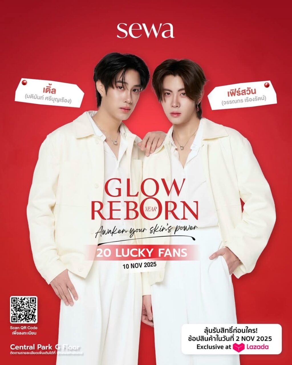 ไม่เชื่อก็ต้องมาพิสูจน์ได้ด้วยตาเนื้อ กับความสนิทสนม ของ เติ้ล เฟิร์สวัน แฟนๆวอร์มนิ้วรอเลย! sewa เล่นใหญ่ ทำถึงทำเกิน! รีบอร์นแบรนด์ครั้งใหญ่ พลิกโฉมวงการสกินแคร์ ชวนแฟนๆมาปาร์ตี้ค่ำคืนสุดพิเศษ sewa Glow Reborn เปิดตัวพรีเซนเตอร์คนใหม่ ซุปตาร์ไทยสุดปังระดับเอเชีย พร้อมกิจกรรมเซอร์ไพรส์ชุดใหญ่ไฟกะพริบ LUCKY FANS SEWA x Tle FirstOne ชวนมัมหมีแฟนด้อม “เขมจิราต้องรอด” มาท้าตบพิสูจน์นวัตกรรมใหม่ “น้ำตบAI” พร้อมกระทบไหล่สุดฟิน ฮ็อปเกินต้านไปกับเสียงละมุนบอยลูกรักพระเจ้า “เติ้ล-เฟิร์สวัน” กลางใจเมือง ในวันจันทร์ที่ 10 พฤศจิกายน 2568 เวลา 18.00 น. เป็นต้นไป ณ Central park ชั้น G