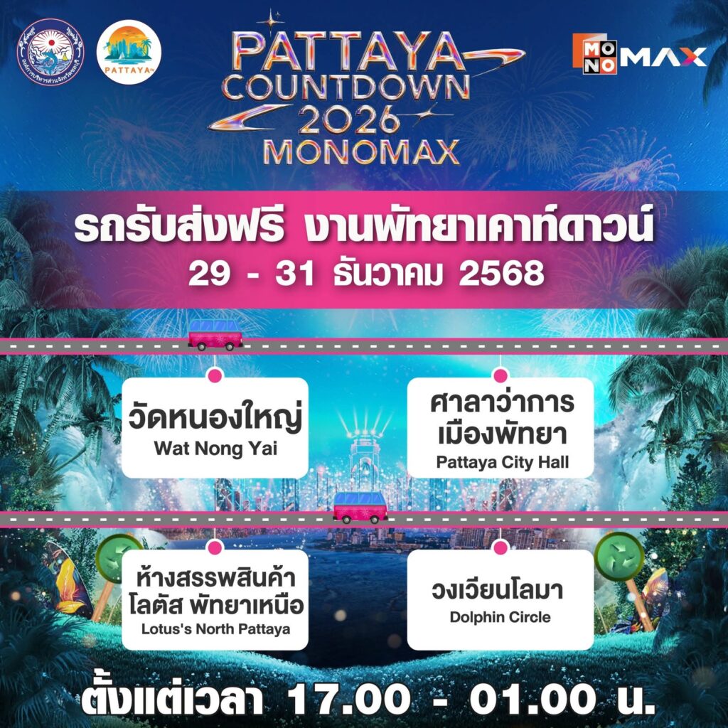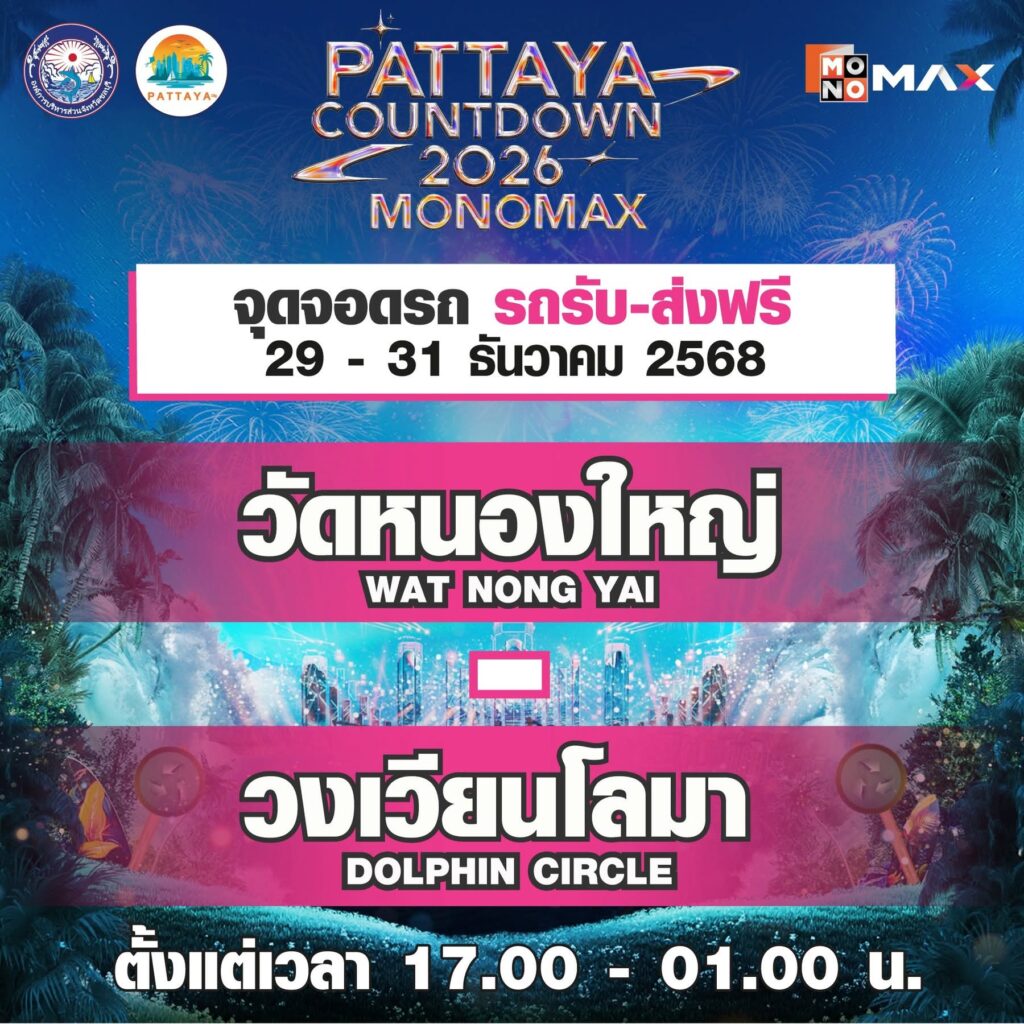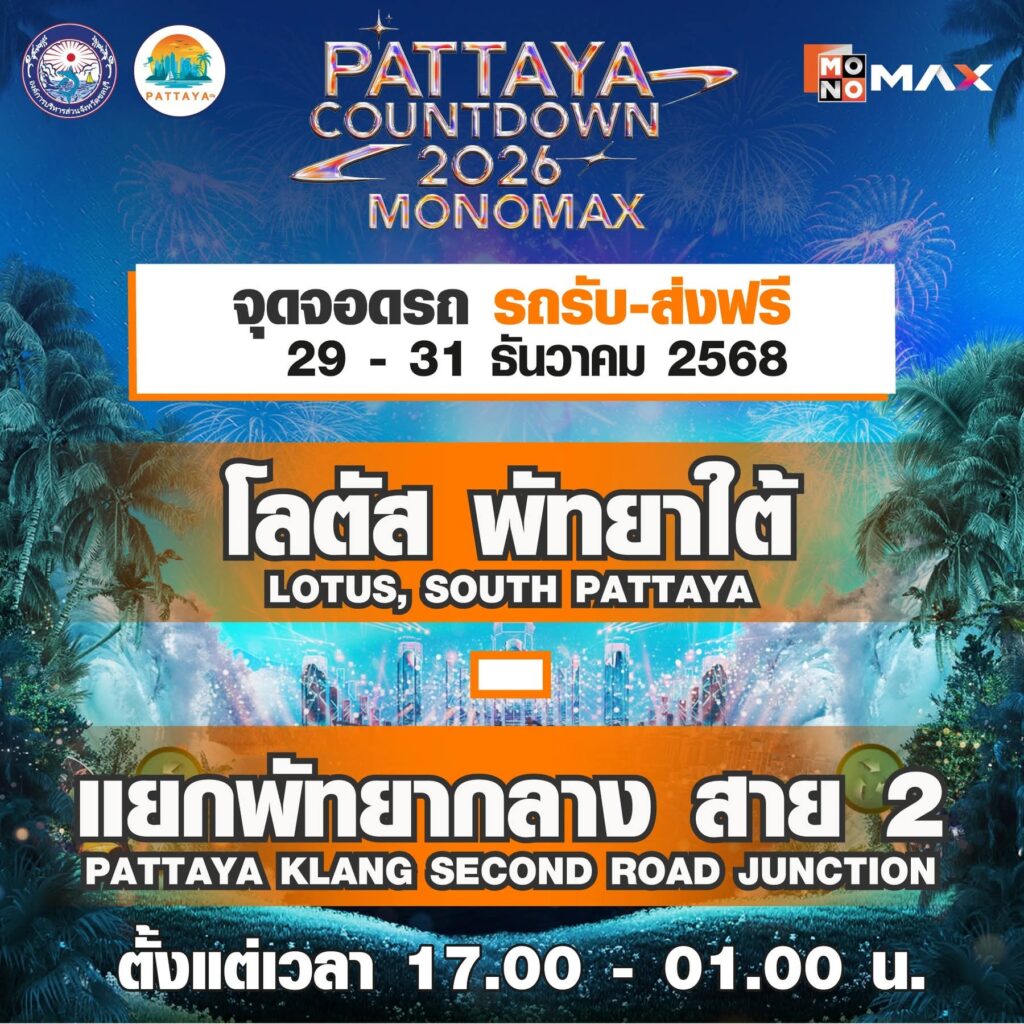จากนั้นเข้าสู่ช่วงไฮไลต์หลักของเทศกาลกับงาน “PATTAYA COUNTDOWN 2026 MONOMAX” ซึ่งจัดขึ้นระหว่างวันที่ 29–31 ธันวาคม 2568 พบกับทัพศิลปินระดับท็อปที่ขนความสนุกมาแบบจัดเต็มตลอดทั้ง 3 วัน ก่อนสัมผัสไฮไลต์การแสดงแสงสีสุดตระการตา ปิดท้ายค่ำคืนส่งท้ายปีด้วยการแสดง พลุและโดรนกว่า 800 ลำ สร้างภาพจำสุดอลังการเหนืออ่าวพัทยา พร้อมโซนบูธอาหารเลิศรสและสินค้าจากเหล่าดารา คนดัง อาทิ จริยา, น้อย โพธิ์งาม, จุ๊บแจง วิมลพันธ์, หมอก้อง สรวิชญ์, อุ๊บ วิริยะ, F.HERO และอีกมากมาย ช่วยเพิ่มสีสันและเติมเต็มบรรยากาศให้เทศกาลปีนี้คึกคัก สนุกสนานตลอดทั้งงาน