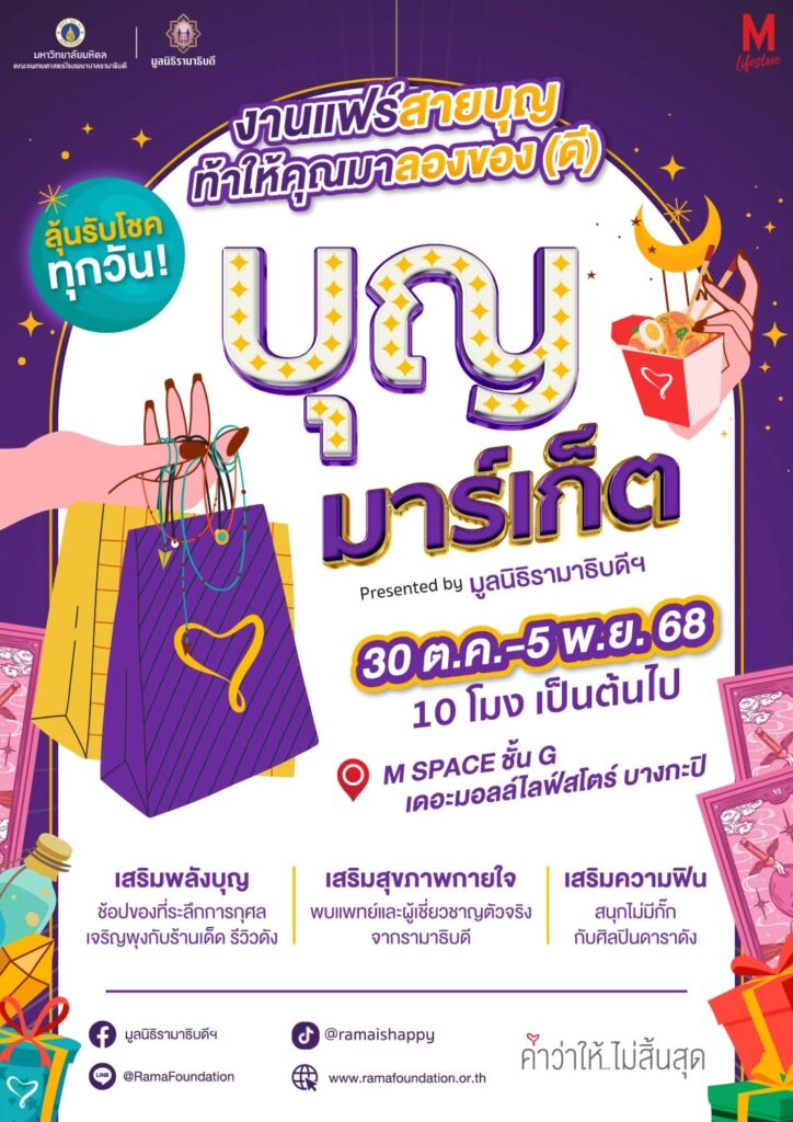 กลับมาอีกครั้งกับงานแฟร์การกุศลที่ทุกคนรอคอย! มูลนิธิรามาธิบดีฯ ชวนร่วมเป็นส่วนหนึ่งของ “การให้” ที่ยิ่งใหญ่ ในงาน บุญมาร์เก็ต ปี 2568 งานแฟร์การกุศลที่จัดขึ้นอย่างยิ่งใหญ่ในโอกาสครบรอบ 60 ปี คณะแพทยศาสตร์โรงพยาบาลรามาธิบดี ที่จะทำให้ทุกคนอิ่มท้อง อิ่มใจ และอิ่มบุญตลอด 7 วันเต็ม ภายใต้คอนเซ็ปต์ “งานแฟร์สายบุญที่ท้าให้มาลอง (ของ) ดี” ยกขบวนร้านอาหารชื่อดัง อาทิ Emily’s เส้นหมี่ไก่ฉีก, Doughnut Library, ลุงใจไข้ปิ้ง, ALittleCatzSweet&Savory, Moodaengs Amphawa, Bonnana house พร้อมกิจกรรมสาระความรู้ด้านสุขภาพ และความบันเทิงมากมายมาไว้ในที่เดียว โดยรายได้จากการจัดงานจะนำไปสมทบทุนช่วยเหลือผู้ป่วยยากไร้ของโรงพยาบาลรามาธิบดี จัดขึ้นระหว่าง 30 ตุลาคม – 5 พฤศจิกายน 2568 เวลา 10:00 – 22:00 น. ณ M SPACE ชั้น G ศูนย์การค้าเดอะมอลล์ไลฟ์สไตล์ บางกะปิ