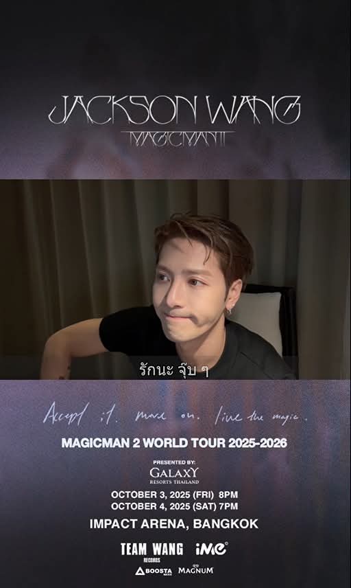 เรียกว่าทุกแพลตฟอร์มโดนยึดพื้นที่ไปด้วย MAGICMAN! และกลายเป็นวาระแห่งด้อมทันทีที่ศิลปินระดับโลก “แจ็คสัน หวัง” (JACKSON WANG) ประกาศเปิดเวิลด์ทัวร์ใหม่ โดยเลือกประเทศไทยเป็นจุดสตาร์ทที่แรก! งาน “MAGICMAN 2 WORLD TOUR 2025-2026 in Bangkok Presented by Galaxy Resorts Thailand” กับ 2 รอบการแสดงสุดยิ่งใหญ่กว่าครั้งก่อน ในวันศุกร์ที่ 3 ตุลาคม 2568 เวลา 20:00 น. และวันเสาร์ที่ 4 ตุลาคม 2568 เวลา 19:00 น. ณ อิมแพ็ค อารีน่า เมืองทองธานี โดยผู้จัด iMe Thailand พร้อมทุ่มไม่อั้นเพื่อความอลังการทุกโชว์