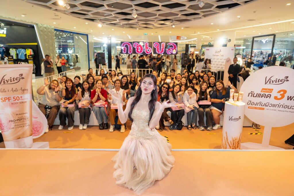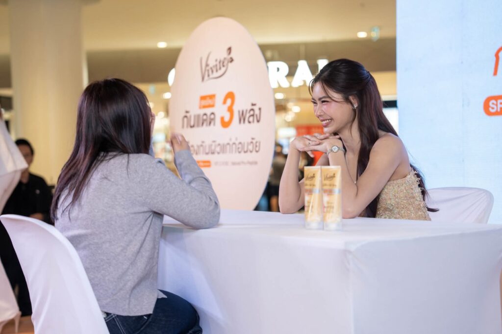 เข้าสู่ช่วงพูดคุยที่ ‘กชเบล’ ได้ร่วมแชร์ประสบการณ์การดูแลผิวและเคล็ดลับการปกป้องผิวจากแสงแดด พร้อมแนะนำผลิตภัณฑ์ “Vivite White & Anti-Aging Body Serum” ที่ตอบโจทย์ไลฟ์สไตล์ของคนรุ่นใหม่ที่ต้องเจอทั้งแดดและมลภาวะ จากนั้นความสนุกก็ทวีคูณขึ้นกับกิจกรรมบนเวทีที่เปิดโอกาสให้ ลัคกี้แฟนผู้โชคดีได้ขึ้นมาร่วมสนุกกับกชเบล อย่างใกล้ชิด สร้างรอยยิ้มไปทั่วทั้งงาน