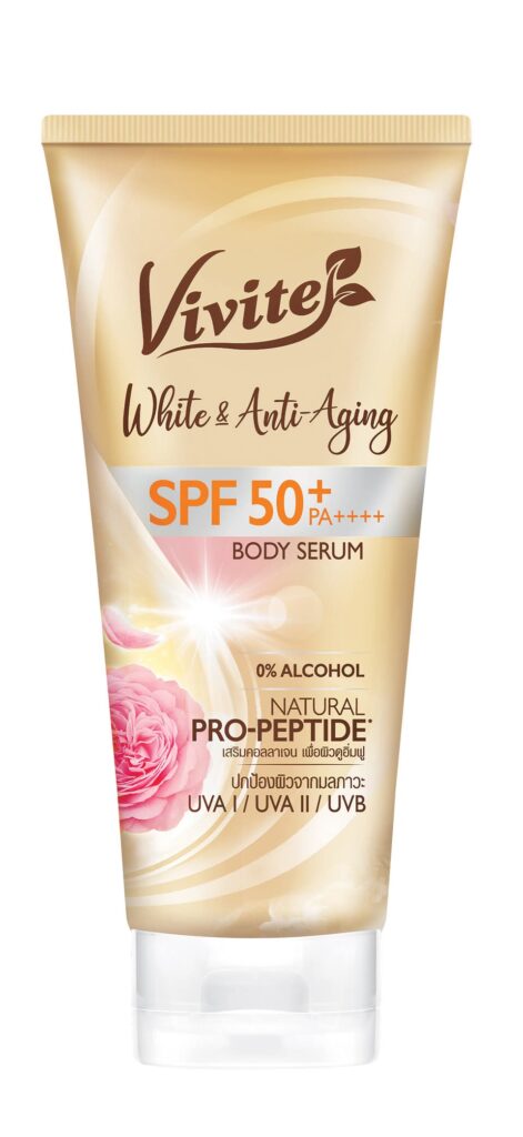 เซรั่มกันแดดเพื่อผิวไบรท์ ไม่กลัวแก่ Vivite White & Anti-Aging Body Serum SPF 50+ PA++++ ที่สุดแห่งนวัตกรรมเซรั่มกันแดดบำรุงผิวกายจากวีไวต์ ที่ผสาน 3 กลไกทรงประสิทธิภาพ ทั้งปกป้อง บำรุง และป้องกันผิวแก่ก่อนวัย ครบจบในขวดเดียว ขนาด 150 มล. ราคา 219 บาท